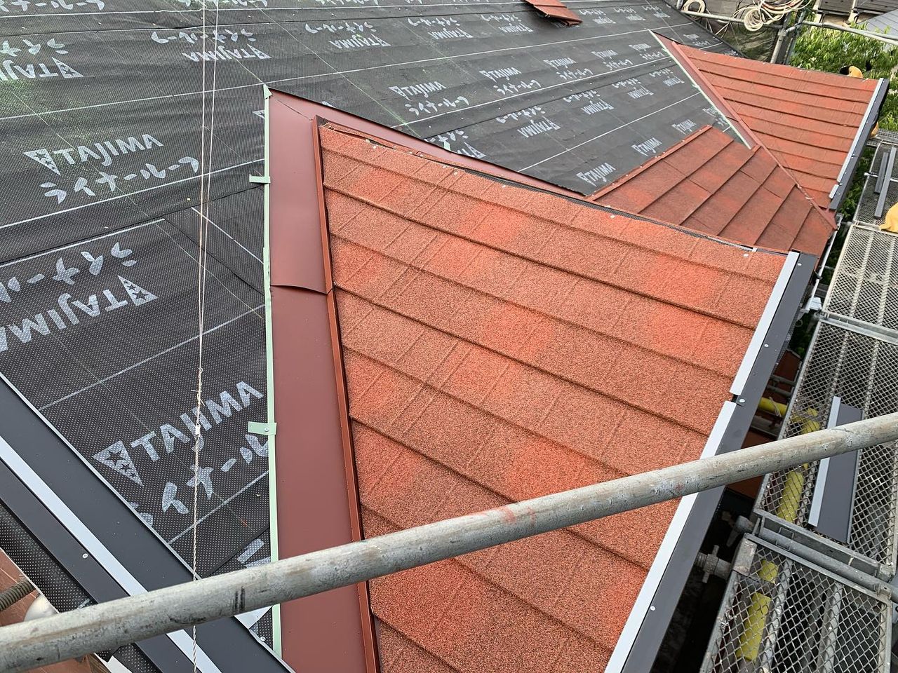 こちらの面は太陽光パネルを戻すので垂木位置をだしてから本体を葺きます。