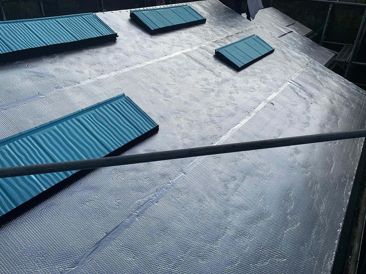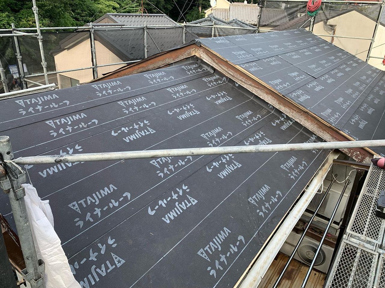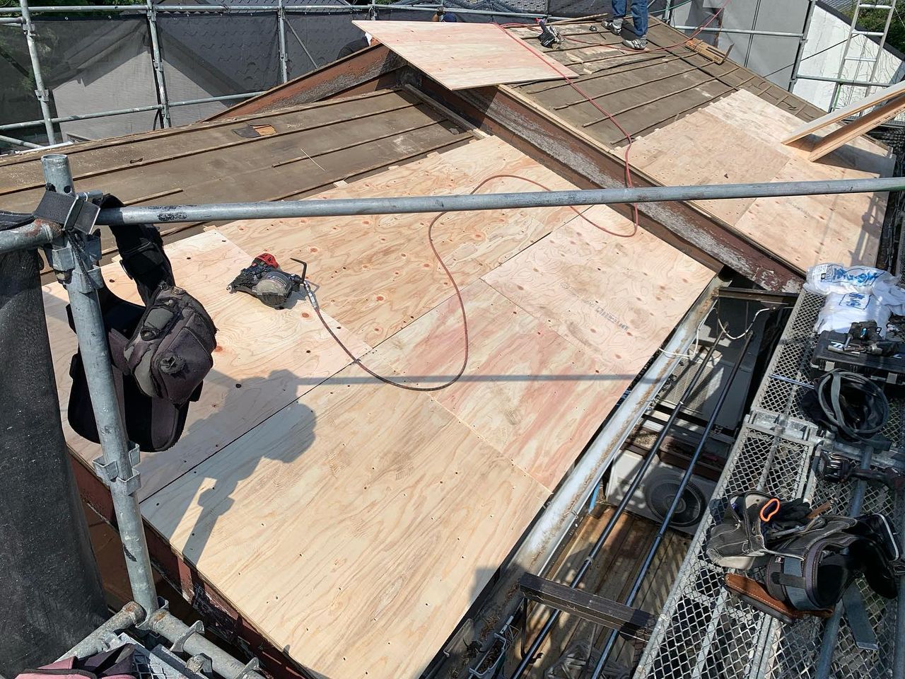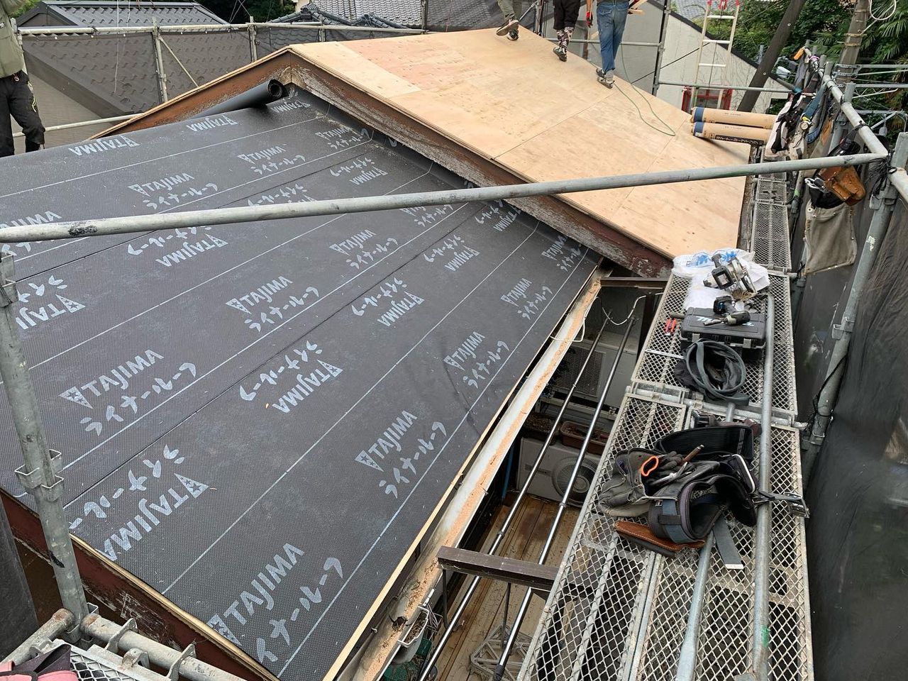 昨日と今日の二日かけて上屋根、下屋根の瓦を降ろし、新しい野地板を貼り、ルーフィング、遮熱シートを貼りました。